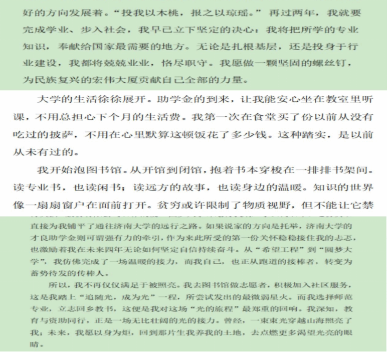 的逐梦之路;有的同学讲述了助学金如何帮助自己缓解经济压力,让自己能够全身心地投入学习;有的同学表达了对老师、学校和社会的感激之情,立志努力学习专业知识,以优异的成绩回报社会;还有的同学描绘了在资助政策支持下,克服困难、追逐航海梦想的坚定决心,字里行间饱含着真挚的情感,展现出航海学子积极向上、自强不息的精神风貌。
