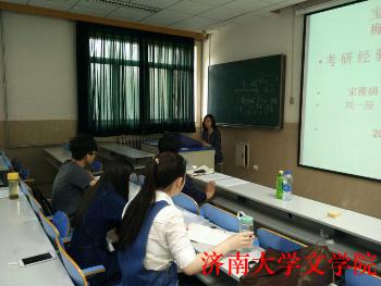 会议伊始,先由王国伟老师对两位同学的到来表示欢迎和感谢,并希望各位同学能珍惜交流的机会,从中得到益处。随后,两位同学分别就考研学校的选择、初试、复试、考研资料的选择以及对待考研的心态分别与大家进行交流。考入青岛大学的刘一辰同学说:“选择学校要量力而行,不要给自己太大的压力,准备考研的过程一定要静下心来,不要三心二意,暂时放下考研之外的事情”,他还特别强调对待考研资料的选择一定要慎重。然后是考入山东大学的宋雅娴同学与大家交流考研经验,她把自己整理的考研题资料拿出来与大家分享。她希望大家都能有一个明确的目标,坚定自己的方向,这样才会有向前的动力。