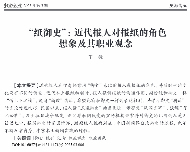 丁捷副教授在《新闻记者》(CSSCI)2025年第3期上发表学术论文《“纸御史”:近代报人对报纸的角色想象及其职业观念》。该论文为2021年度国家社科基金一般项目“晚清新式官报史料整理与研究”(项目批准号:21BXW026)的阶段性成果。