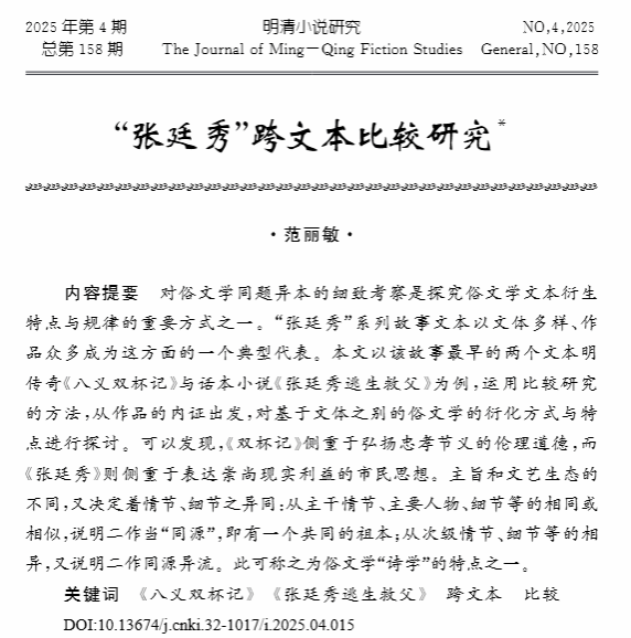 范丽敏教授在《明清小说研究》(CSSCI)2025年第4期上发表学术论文《“张廷秀”跨文本比较研究》。该论文系国家社会科学基金一般项目“明成化刊本说唱词话跨文本文献整理与研究”(20BZW065)的重要阶段性成果。