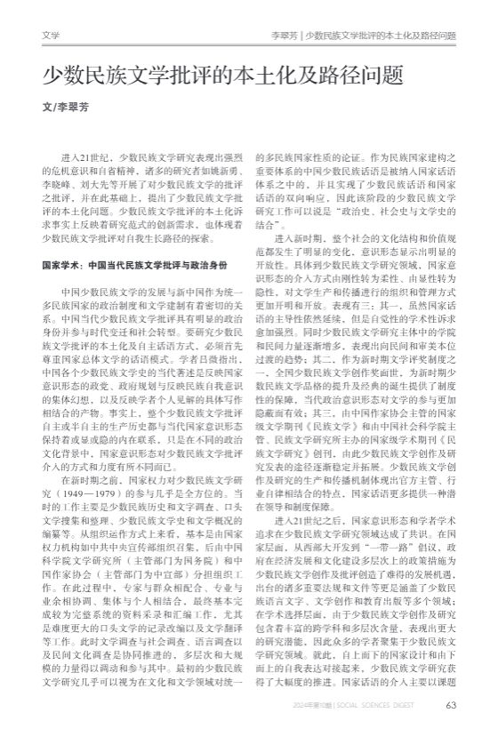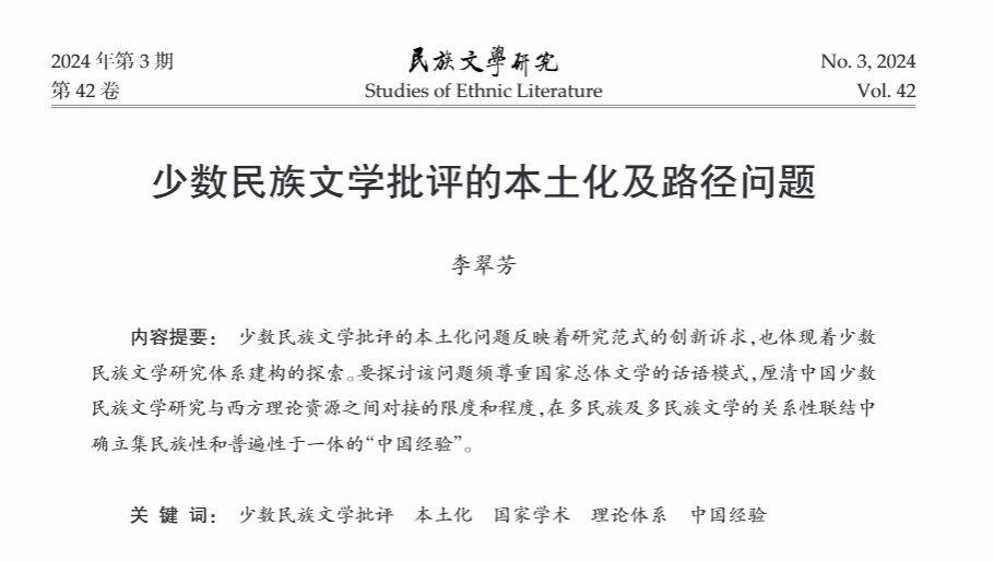 李翠芳教授在《民族文学研究》(CSSCI)2024年第3期上发表学术论文《少数民族文学批评的本土化及路径问题》。该论文系国家社会科学基金一般项目“中国少数民族红色文学经典的生产机制研究”(22BZW187)的重要阶段性成果。该文章被《社会科学文摘》2024年第10期全文转载。